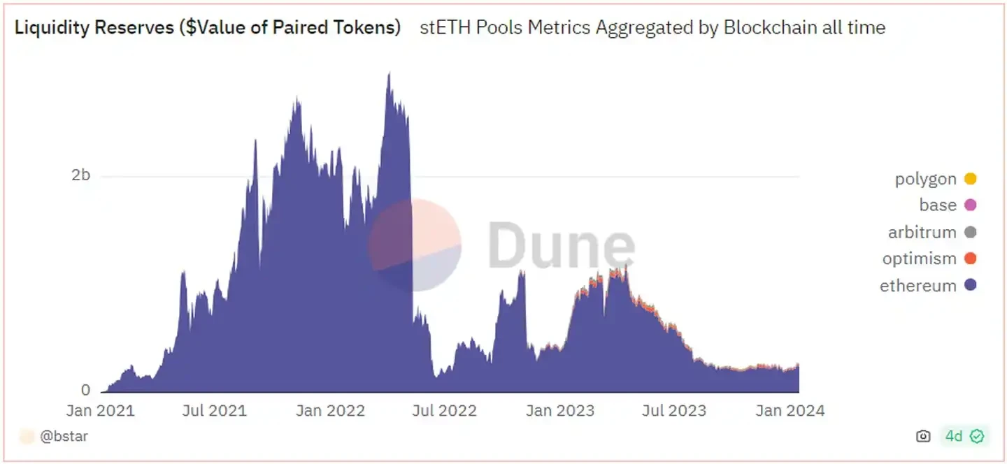 根据 Lido 的 stETH 流动性 Dune 仪表板数据,目前在去中心化交易所中,大约有 2.74 亿美元的流动性。