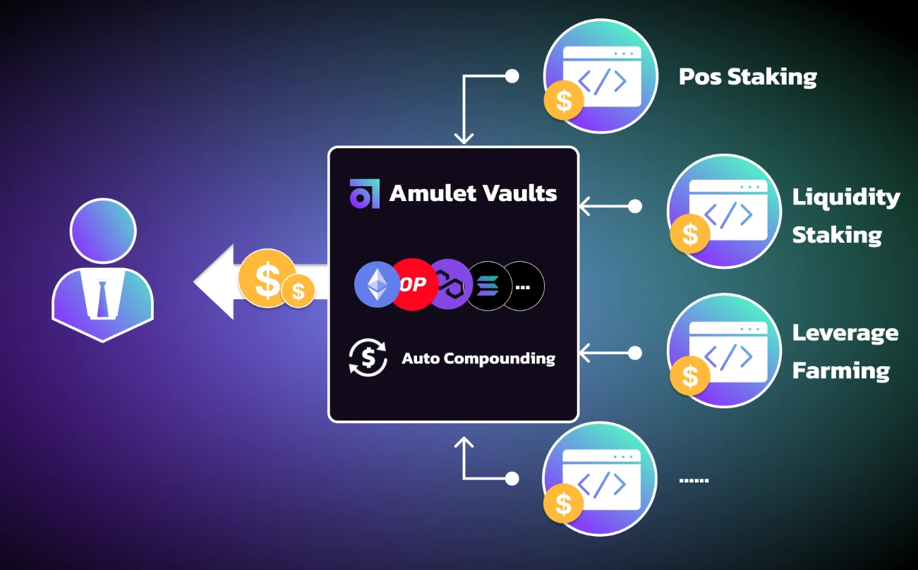 Amulet V2使用 ERC-4626 代币化保险库标准,实现与众多Web3收益平台无缝整合。用户可以将其资产存入 Amulet Vaults,通过由智能合约管理的预定收益策略,例如 PoS 质押,流动性质押,杠杆挖矿等以产生收益。产生的收益有多种形式,包括质押收益以及额外的 AMU 代币,并且所产生的收益还将由平台自动重新投资以获取复合收益。