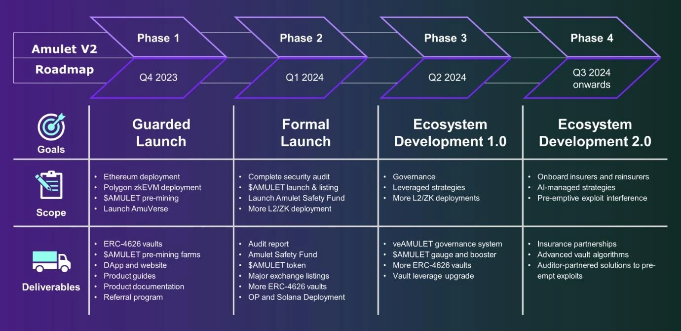 Amulet 团队表示计划在 2024 年进一步扩展其产品功能和市场覆盖范围,包括进行安全审计、正式上线、代币发行和社区扩张等关键环节,同时计划将平台推广至更多的区块链生态系统,以及推出更多自研的收益策略和保险服务。