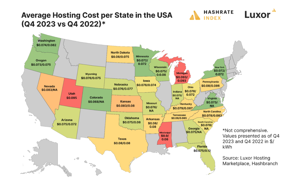 总体而言,2023 年比特币挖矿托管费用有所下降。