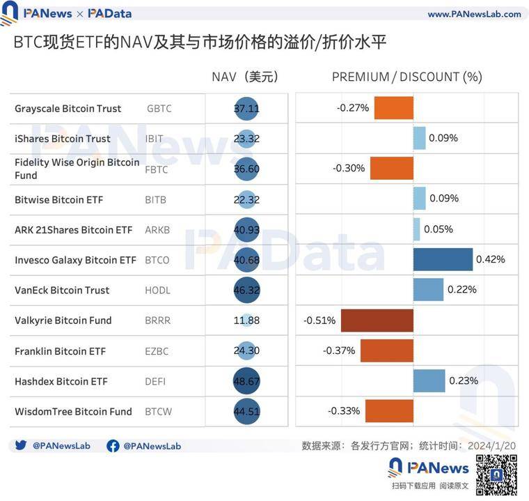 以 1 月 19 日 ETF 的 NAV(Net Asset Value,单位净资产)为基准,与当日的收盘价相比较,可以看到,11 只比特币现货 ETF 中有 5 只处于折价状态,即当前市场价格低于 NAV。其中折价水平最高的是 BRRR,折价率为 0.51%。FBTC、EZBC 和 BTCW 的折价率相当,都超过了 0.3%。GBTC 的折价率最低,约为 0.27%。