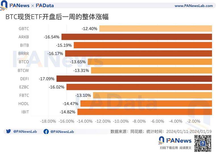 - 比特币现货 ETF 开盘后至今出现普跌局面,以 19 日收盘价较 11 日开盘价的涨幅为计,11 只 ETF 的市场价格平均下跌了 14.80%。