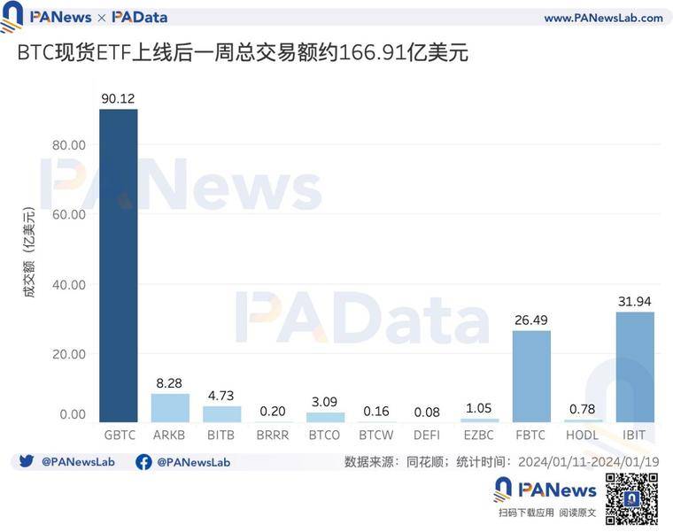 - 比特币现货 ETF 上市后 6 天内的总交易额约为 166.91 亿美元。其中,GBTC 是交易规模最大的一只 ETF,6 天总交易额达到了 90.12 亿美元,其次是 IBIT 和 FBTC,分别达到了 31.94 亿美元和 26.49 亿美元。
