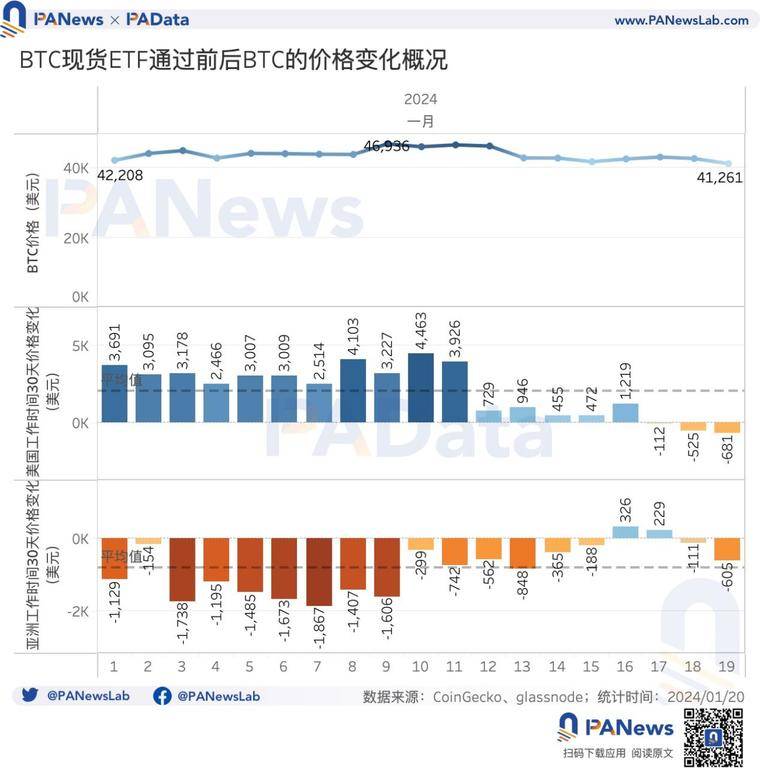 亚洲工作时间(即中国标准时间上午 8 点至晚上 8 点之间),在比特币现货 ETF 上市前后,比特币每日价格较 30 天前的基本都有所下跌。在 ETF 上市前(含 11 日当日),比特币每日价格较 30 天前的几乎都要下跌 1000 美元以上,上市后这一跌幅明显收窄至 1000 美元以内。