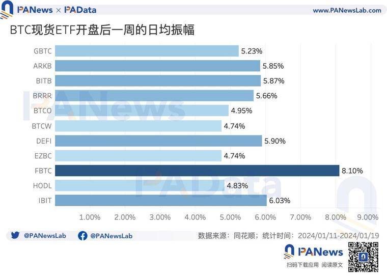 在这些 ETF 中,富达的 FBTC 日均振幅最高,达到了 8.10%。其他大多数 ETF,包括 GBTC、BITB、IBIT 等的日均振幅基本在 5%-6% 的水平。仅 BTCW 和 EZBC 两只 ETF 的日均振幅低于同期比特币的日均振幅。