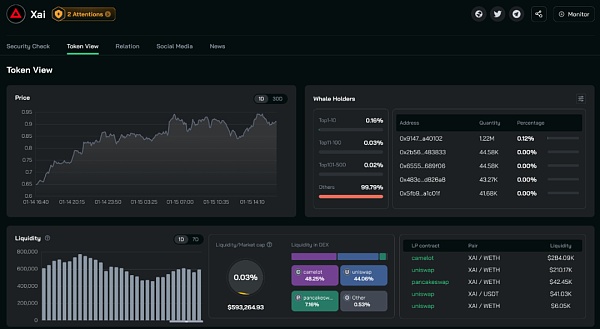 Xai已发行代币XAI,该代币将作为Xai链的gas代币和节点奖励,更多用途需等待其网络中游戏上线才能知晓。目前Xai已收录至EagleEye,用户可查询或监控相关链上活动。