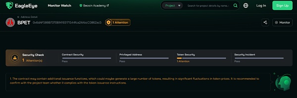 用户可通过 EagleEye 平台查询代币合约地址的风险。EagleEye会对代币合约风险进行检测和提示,帮助用户规避潜在损失。以下是对xPet项目$BPET代币的无限铸币提醒: