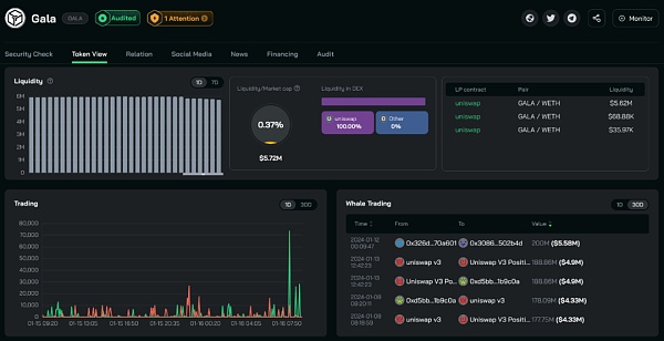 Gala Games已上线多款游戏,并将其业务拓展至音乐和电影领域。在2023年1月,Gala Games优化了其代币模型,在Gala平台上用 Gala 代币进行购买与支付时,所花费的Gala代币将被分配给节点以增加节点收益。用户可通过EagleEye监测Gala代币的链上活动: