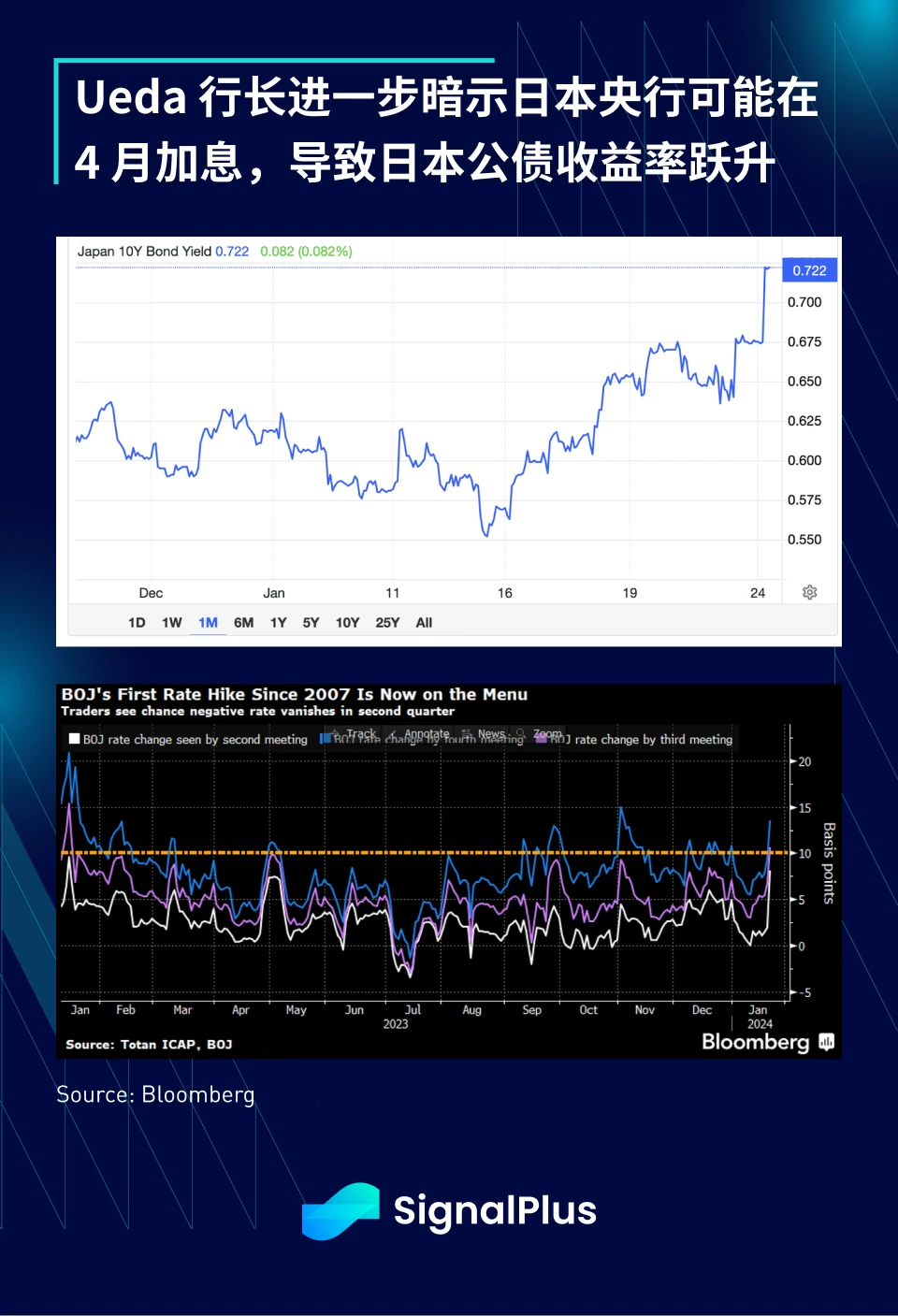 说到日本, 10 年期日本公债收益率已从本月低点跳升了 18 个基点,由于日本央行行长 Ueda 明确将 4 月加息列入考虑,收益率在过去两天又出现一波上涨;Ueda 行长周二在记者会上表示,如果“通胀目标在望”,同时工会也一直在劳资谈判中要求更大幅度的加薪,日本央行将“考虑”结束负利率政策,他也认为,日本央行可以避免在终止负利率政策时出现中断,不过交易员也在关注可能随之而来的反驳新闻,这种情况自 Ueda 接任以来经常发生。