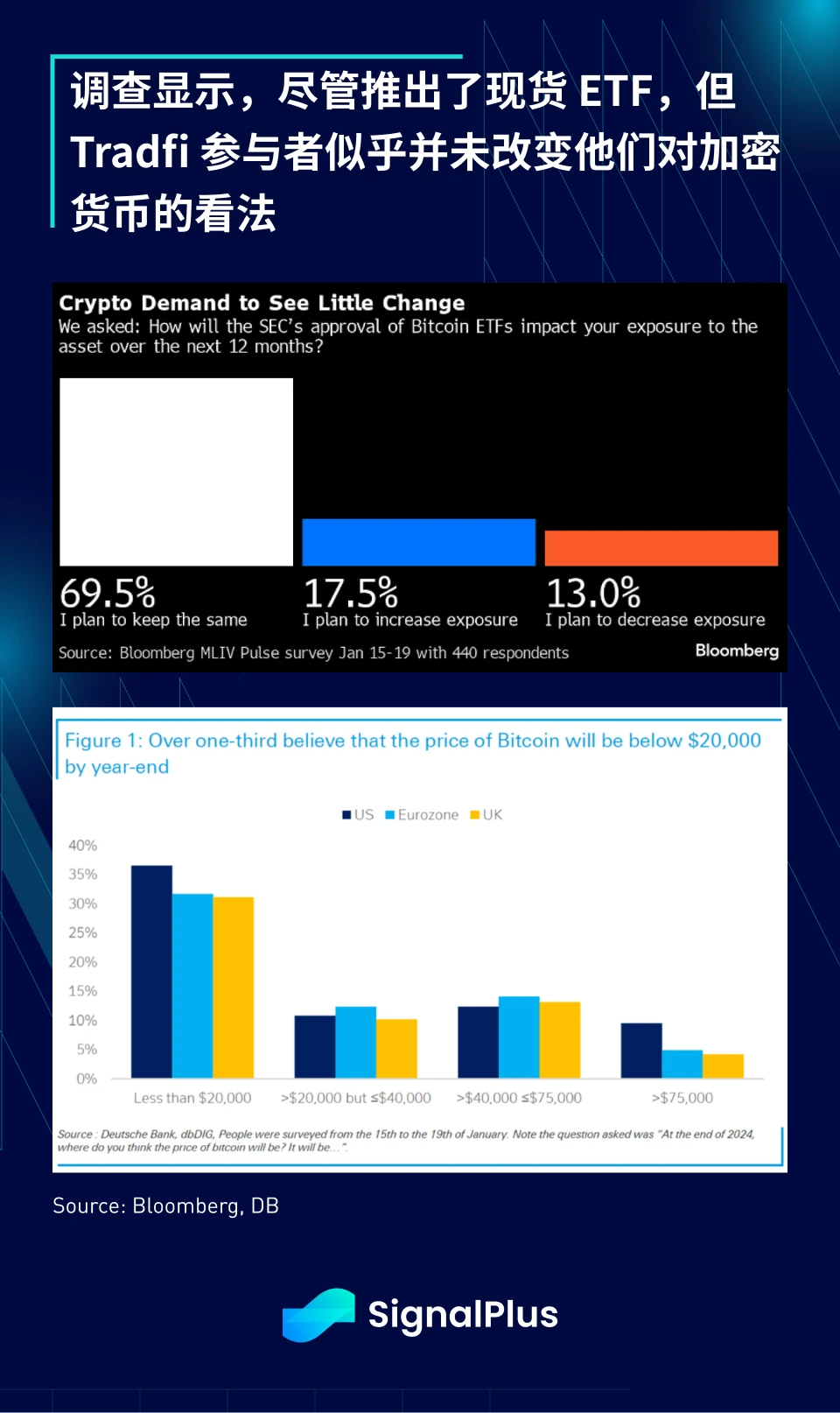 此外,Bloomberg 和一些券商的调查显示,主流群体对加密货币的需求或投资情绪在短期内的变化不大,虽然 ETF 的推出增加了加密货币的合法性,但没有增加虚拟资产的参与度;Deutsche Bank 的一项调查显示, 1/3 的受访者认为 BTC 到年底前将跌至 2 万以下(应该买一些便宜的看跌期权),这与行业参与者的预期非常不同,看来前面的道路仍然漫长!