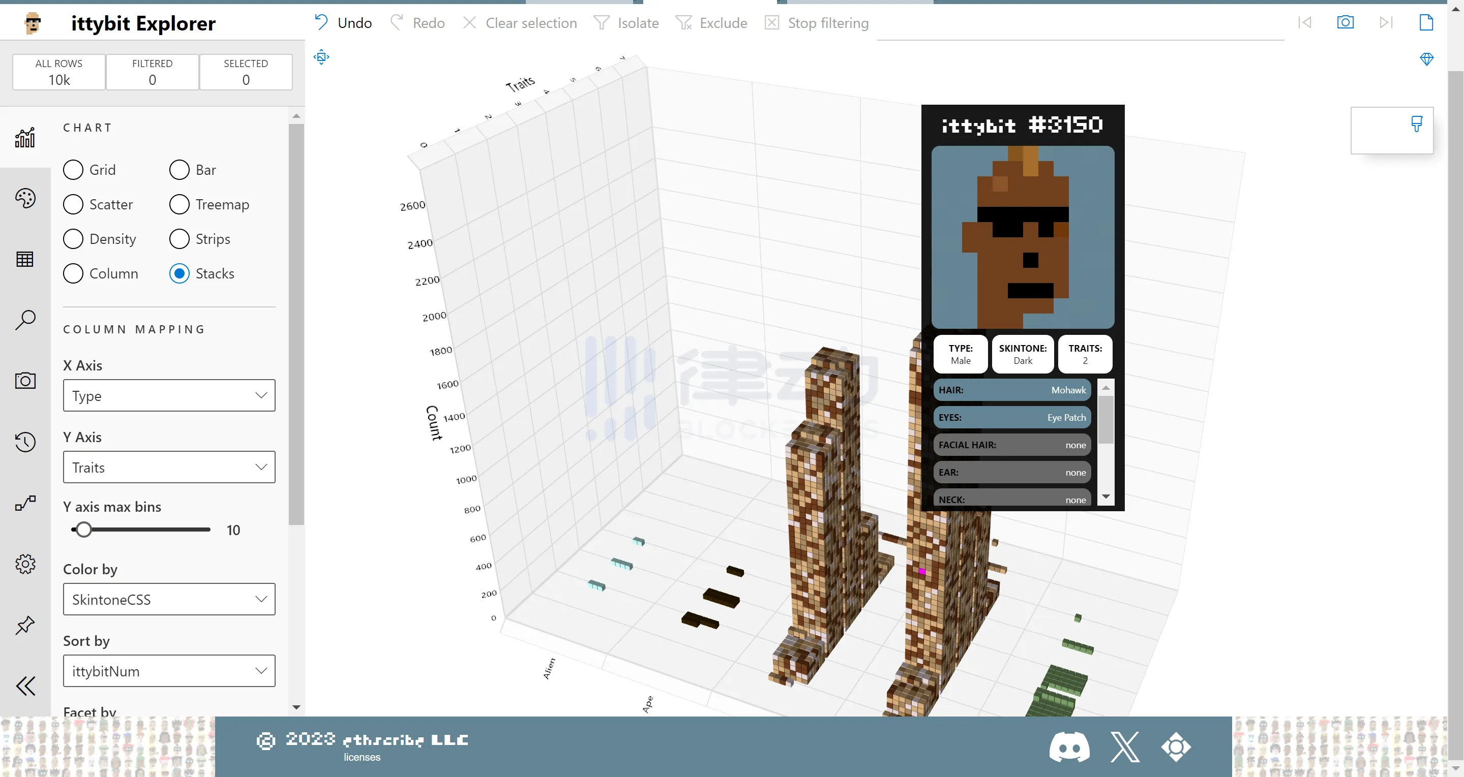 这就是我们在文章标题中提到的「 10 倍涨幅项目」。ittybits 总量 10000 个,发行于 1 月 6 日,Mint 价格为 0.007/0.009 ETH。目前,ittybits 的地板价为 0.0795 ETH,依然是发售价格的 10 倍,总成交额也超过了 166 万美元。ittybits 的地板价最高时曾到过 0.12 ETH,哪怕是现在依然超过以太铭文上的第一个 NFT 系列 Ethereum Punks,是目前 ORDEX 上当之无愧的第一明星。