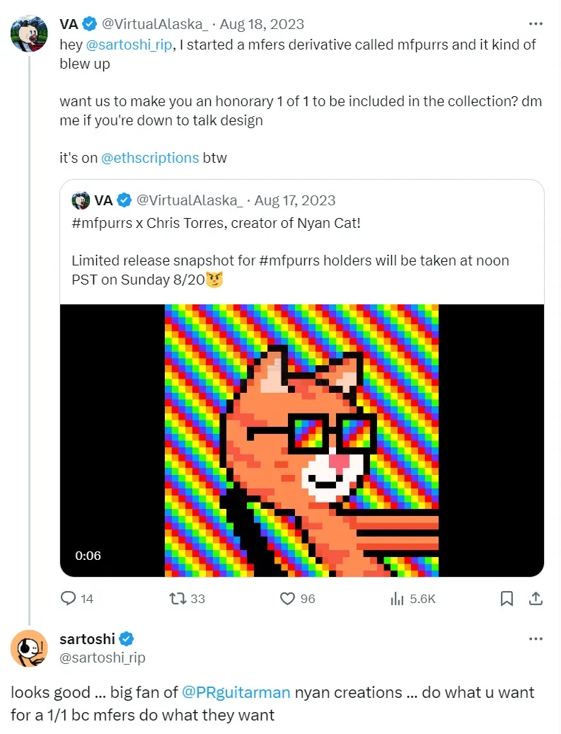 mfers 的创始人 sartoshi 也在 @VirtualAlaska_ 的推文下对 mfpurrs 表达了肯定: