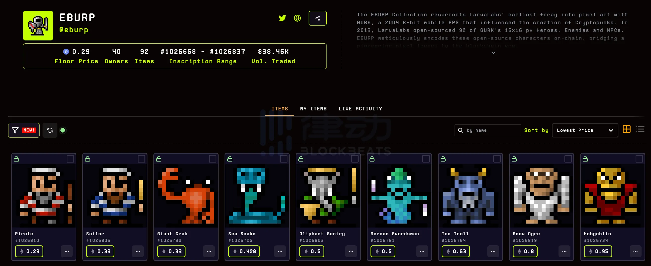 在 ittybits 让 ORDEX 吸引到了众多关注后,EBURP 也随之上涨,最高地板价曾突破 0.7 ETH。