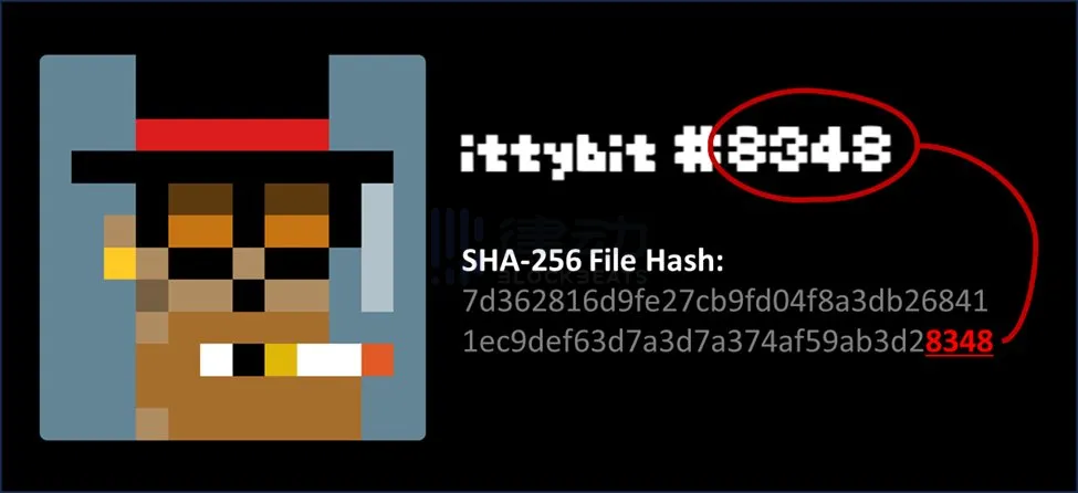 除了 12 x 12 对原始 CryptoPunks 进行像素压缩的艺术表达,每个 ittybits 的 ID 编号也匹配其 SHA-256 文件哈希的最后四位数字相匹配。