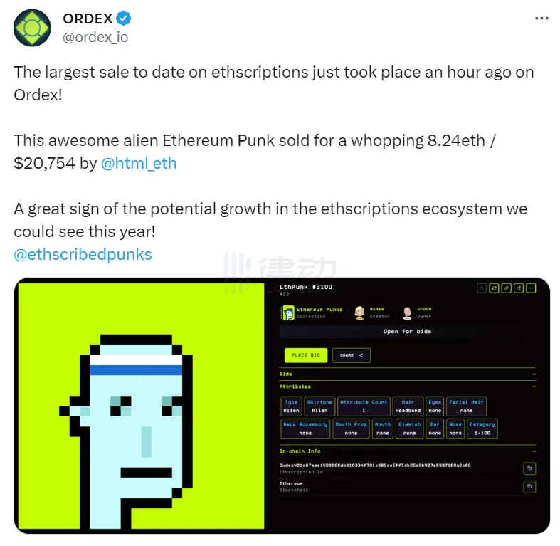 - ORDEX 已经跑出了一些有财富效应的项目。 特别是经过 10 倍的 ittybits 之后,越来越多的 ETH NFT 玩家注意到这个去年就已经上线的市场。随着以太铭文小图片的发展,ORDEX 有望借着先发优势持续发展。