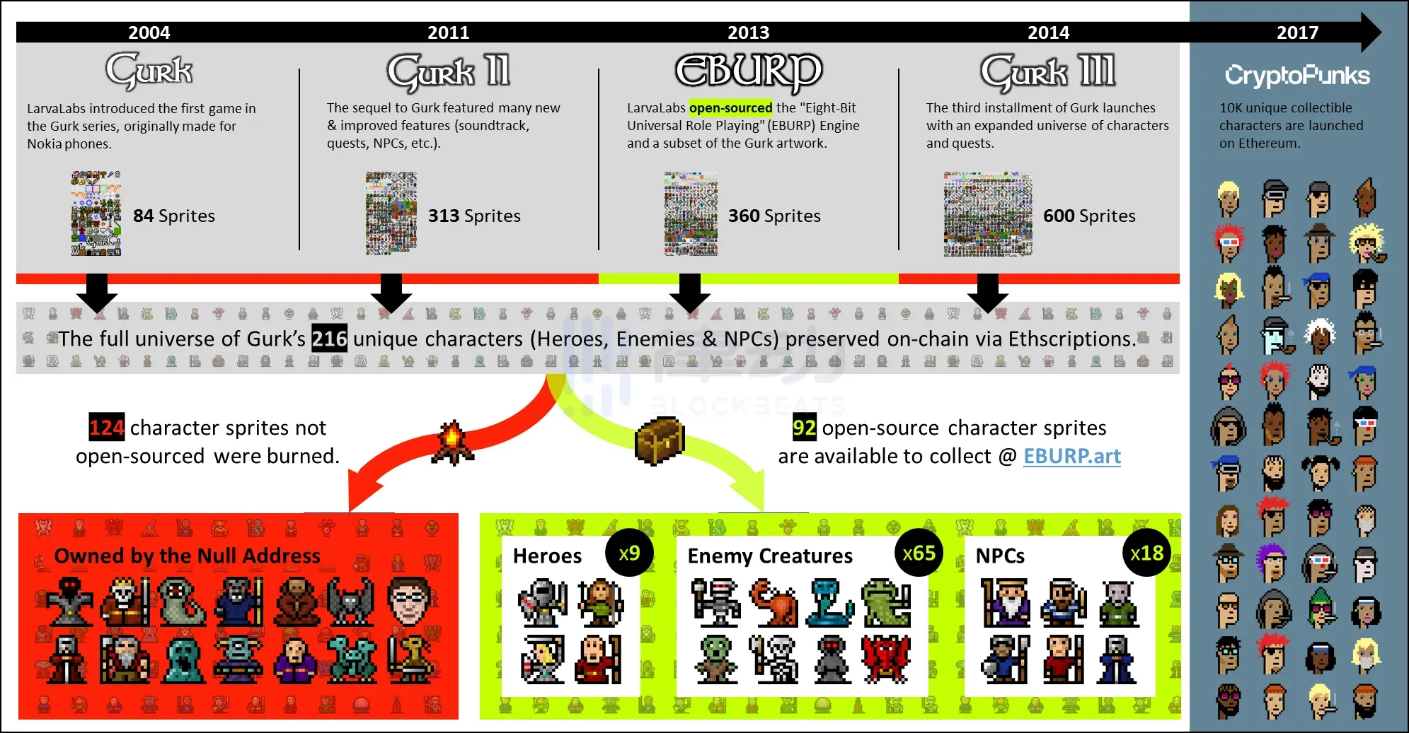 2013 年,Larva Labs 联合创始人 @pents 90 通过 EBURP 引擎开源了 GURK 游戏内的部分艺术作品。虽然 GURK 游戏中一共拥有 216 个独特的游戏角色,但是 EBURP Github 库中只有 92 个游戏角色(包括英雄、敌人和 NPC)被开源。
