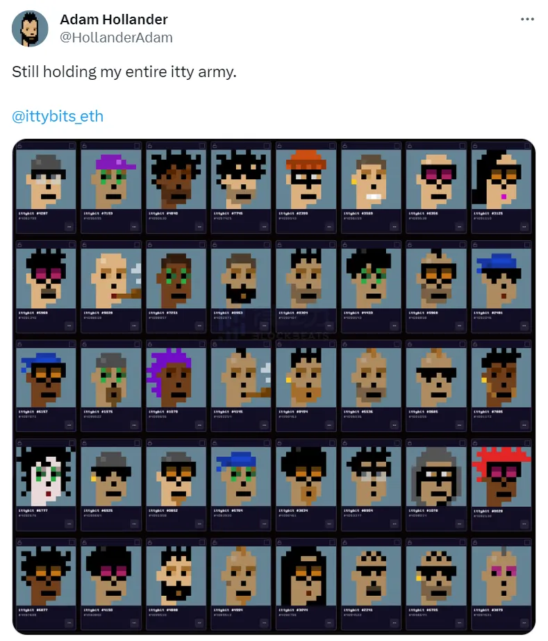 加上其作为铭文的 Fully on-chain 叙事,ittybits 在英文圈快速得到了很多关注。比如用 2.5 BTC 赢得了 Shadow Hats 拍卖的 @HollanderAdam 就购入了一批 ittybits。