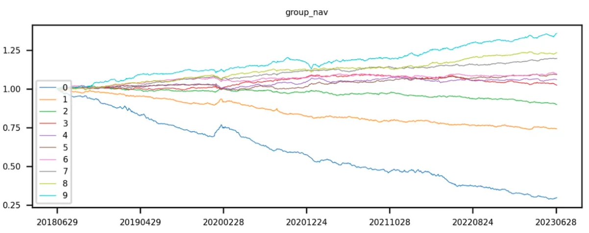 理想状态下,一个好的因子,第 9 组的曲线收益最高,第 0 组的曲线收益最低。