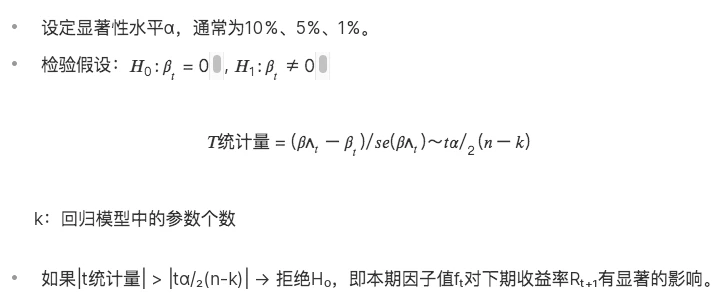 T 值(回归法):T 值体现下期收益率对本期因子值线性回归后系数的显著性,通过比较该回归系数是否通过 t 检验,来判断本期因子值对下期收益率的贡献程度,通常用于多元(即多因子)回归模型。