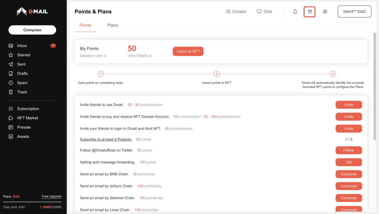 需要注意的是,Dmail 为鼓励更多用户进入Web3世界,陆续集成 Ethereum、BNB Chain、Polygon、Starknet 等 18 条网络并推出积分奖励计划,可以让用户升级权益,在平台上体验各种高级功能,同时成为未来各种官方空投活动的用户凭证和标志,甚至可以成为未来 Dmail DAO 发展的基础。