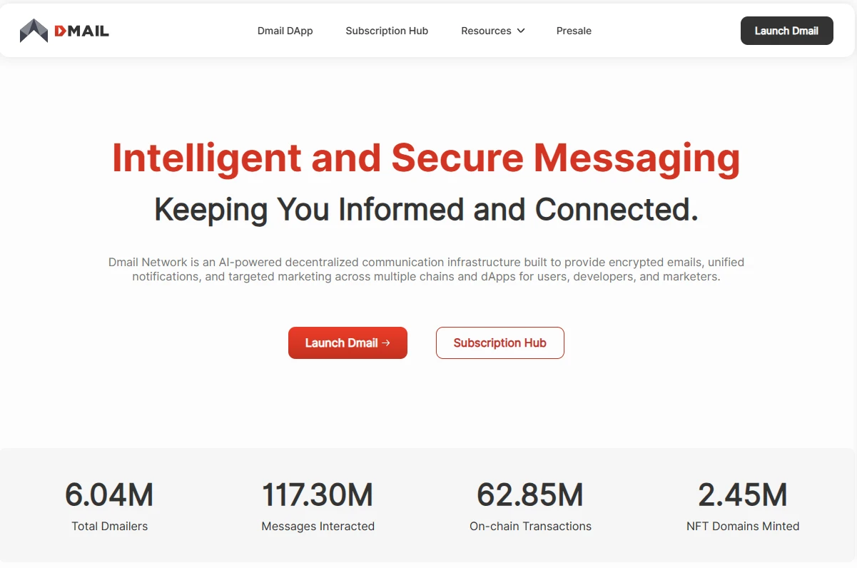具体而言,Dmail 打造 AI 驱动的去中心化通信平台,提供加密的电子邮件服务、统一的通知系统和量身定制的营销解决方案,无缝跨越多个区块链网络和去中心化应用程序(dApp),满足 Web3 领域用户、开发人员、营销人员和影响者的需求。