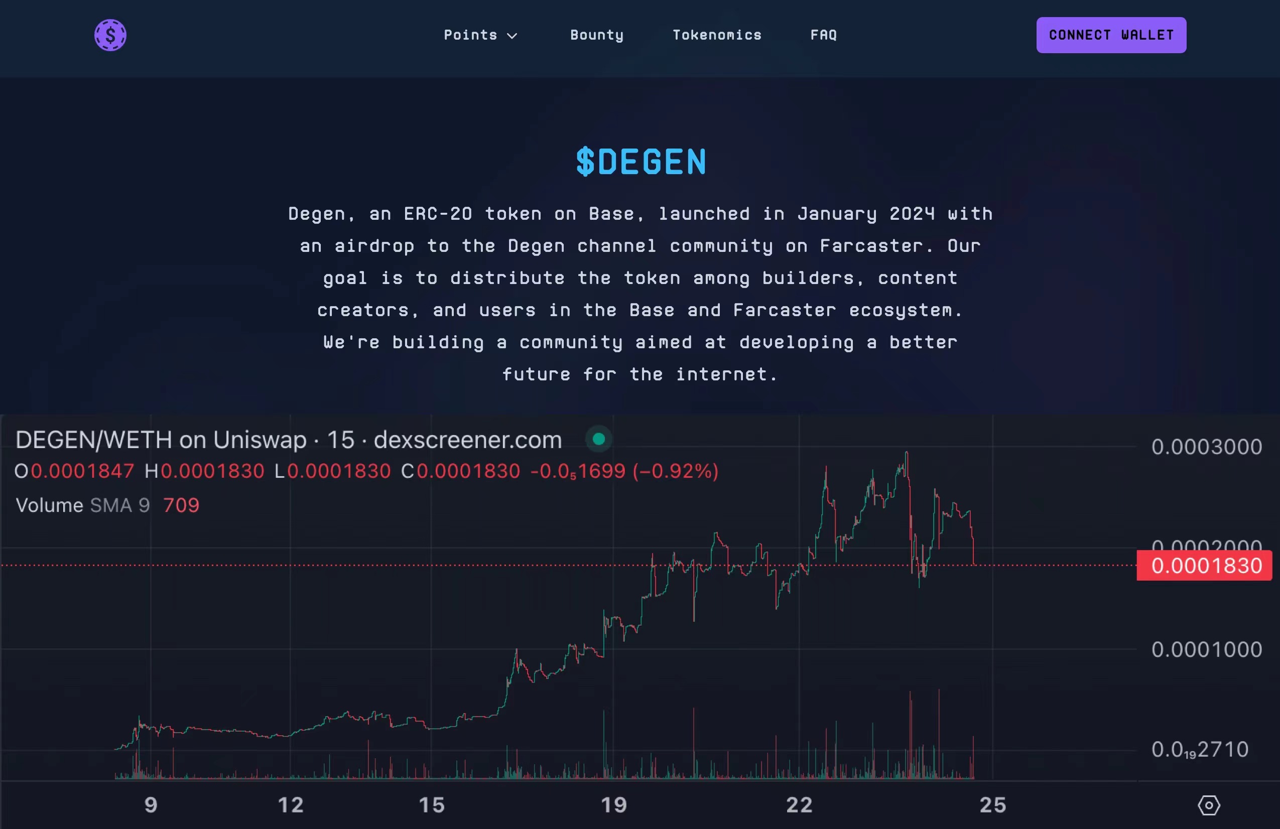 项目方想要流量,用户想要币,积分是二者之间一个微弱的连接点。比如 $DEGEN 在这方面做到了很好的平衡,这是一种空投到 Farcaster 上 Degen 频道社区的 meme 币,用户在频道内发贴可以获得积分,积分则可以明确转化成代币,并且还将推出第二季空投。