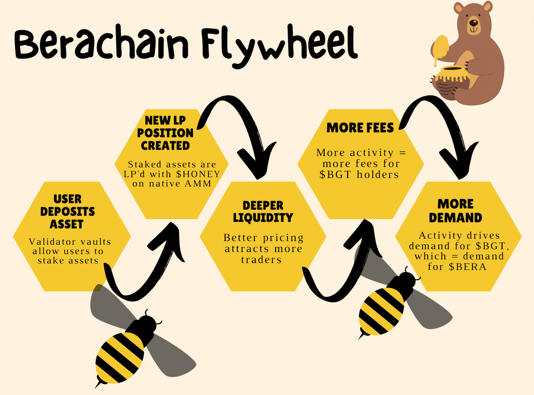 总结来说,用户将资产(如 ETH、BTC、USDC 等)存入系统,从而获得 Bera 代币。随后,系统利用这些资产与 Honey 配对,为 AMM 等协议提供流动性。这种增强的流动性进而吸引了更多的交易者和项目参与,从而为 BGT 带来更多的交易费用。由于 BGT 仅能通过质押 Bera 获得,这一机制吸引了更多用户质押 Bera 以产生 BGT。这样,系统不断吸引更多的资产加入,以获取 Bera,形成了一个飞轮,具体如下: