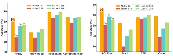 同样,在涉及常识推理和阅读理解的测试中,Mistral 7B的表现优于这两个Llama模型,准确率分别为69%和64%, 凸显了其在深度语言理解领域的优势 。