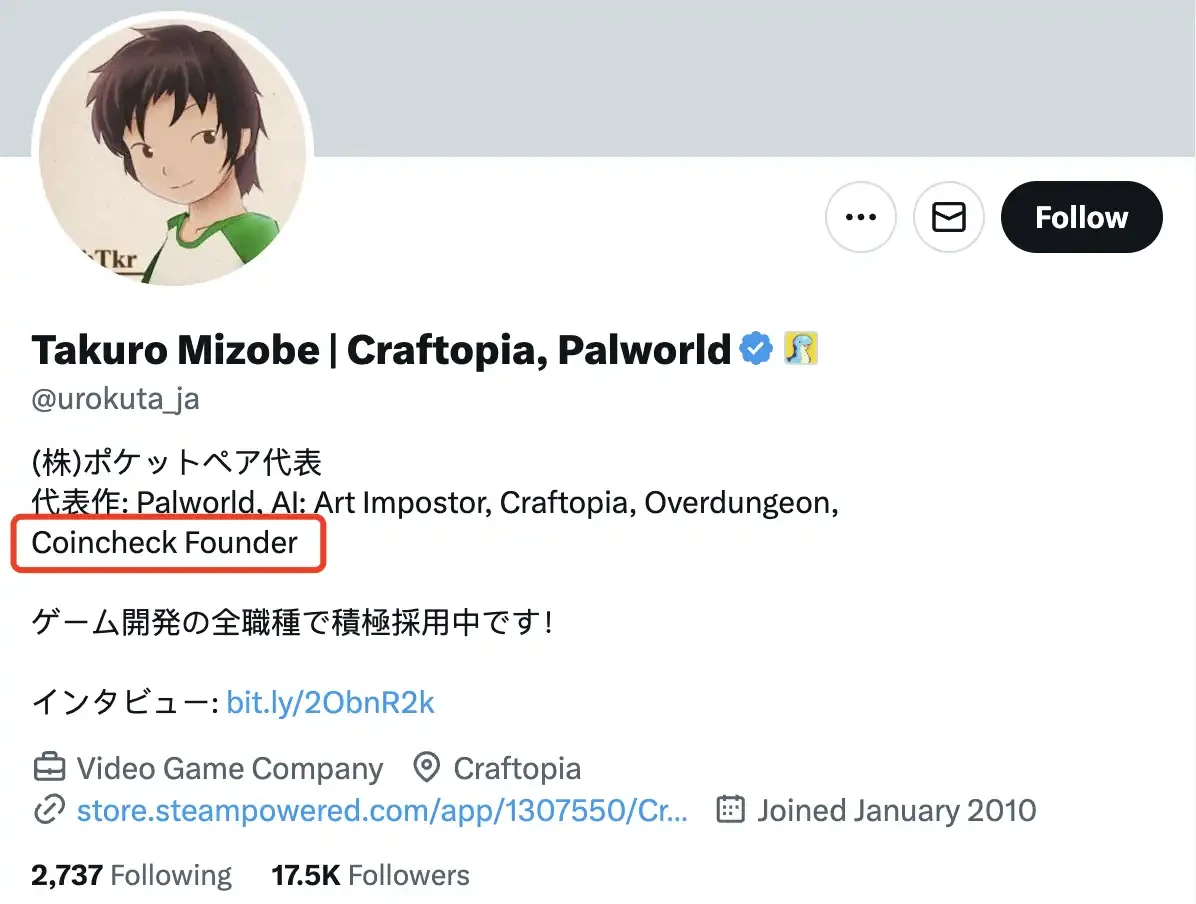 随着游戏热度只增不减,人们开始对这款只有四个早期开发人员的小成本游戏产生了好奇。而有人发现,Palworld 发行公司 Pocket Pair 的联创沟部拓郎(Takuro Mizobe)以前曾创办过一家加密货币交易平台,Takuro 的 X 账户简介中也自称是「Coincheck Founder」。