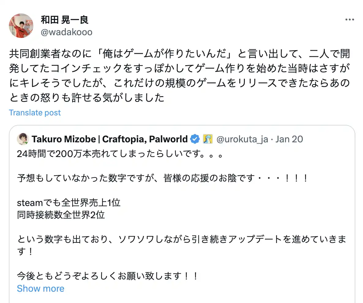 「尽管我是联合创始人,但当我说「我想做游戏」时,我们完全放弃了一起开发的 Coincheck,开始制作游戏。」Coincheck 联创 Koichiro Wada 在 Takuro Mizobe 庆祝 Palworld 销量突破 200 万时评论道。