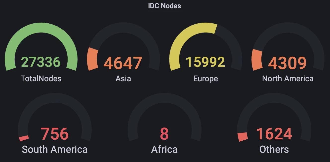 Meson 官网显示,其总结节点数已经超过十万,目前为 115194 节点,其 IDC 广泛分布于世界各地。其带宽容量约 20 Tb/s,平均延迟为 90 ms。