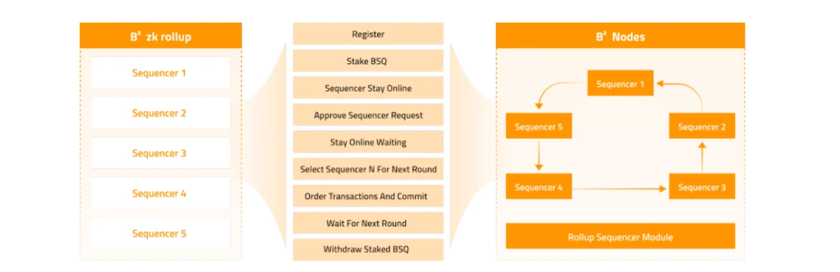 序列器选择器模块:实现了类似 DPoS 的机制,选择一组序列器为特定时期提供交易排序和打包服务。竞争成为序列器的个人或组织必须抵押一定数量的代币 BSQ,并准备必要的硬件资源。用户可以将其代币 BSQ 委托给竞争序列器位置的候选者。运营序列器服务的候选者可以获得一定比例的交易费和额外的代币 BSQ 奖励。