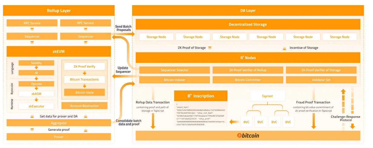 B² Network 的技术架构总体分为两个方面来看,即 Rollup 层和数据可用性层。