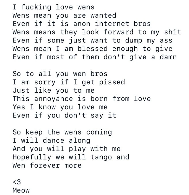 meow 表示,过去一个月内他几乎每天都会收到无数“Wen token”、“Wen airdrop”之类的问题,为此 meow 还特地用开玩笑的口吻写了一篇诗作为回应。在诗中,meow 写道:“Wens 意味着你们有多渴望 my shit,甚至有些人都已经想 dump my ass 了……”