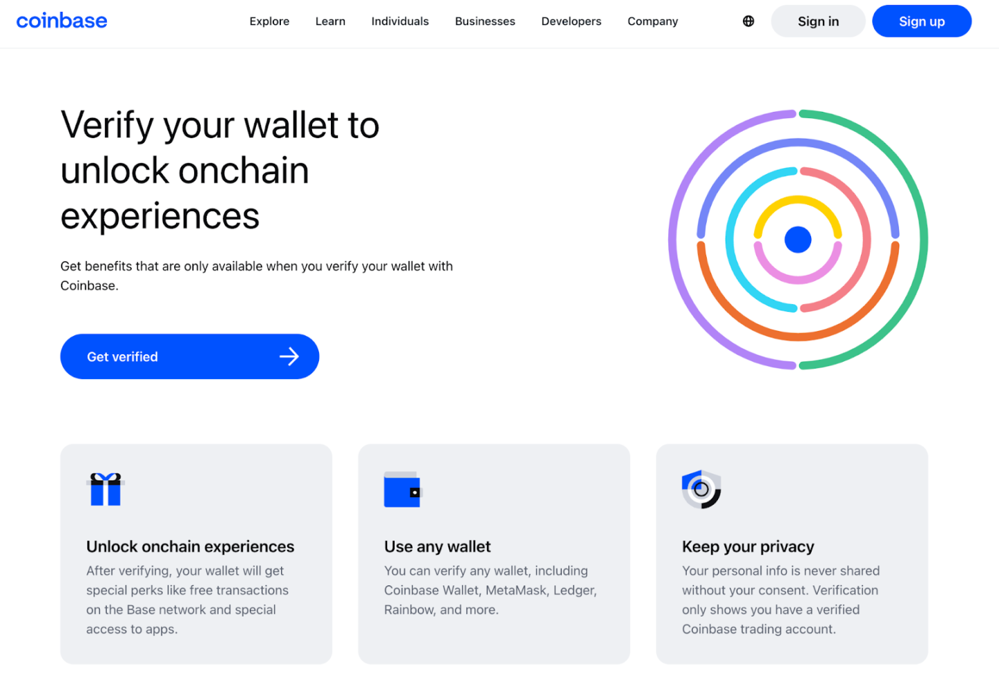 例如,Coinbase 的「验证」产品利用以太坊证明服务发行 Coinbase 验证的链上证明,包括 KYC 证明。用户通过独家特权优惠的激励选择加入验证。(来源:Coinbase)