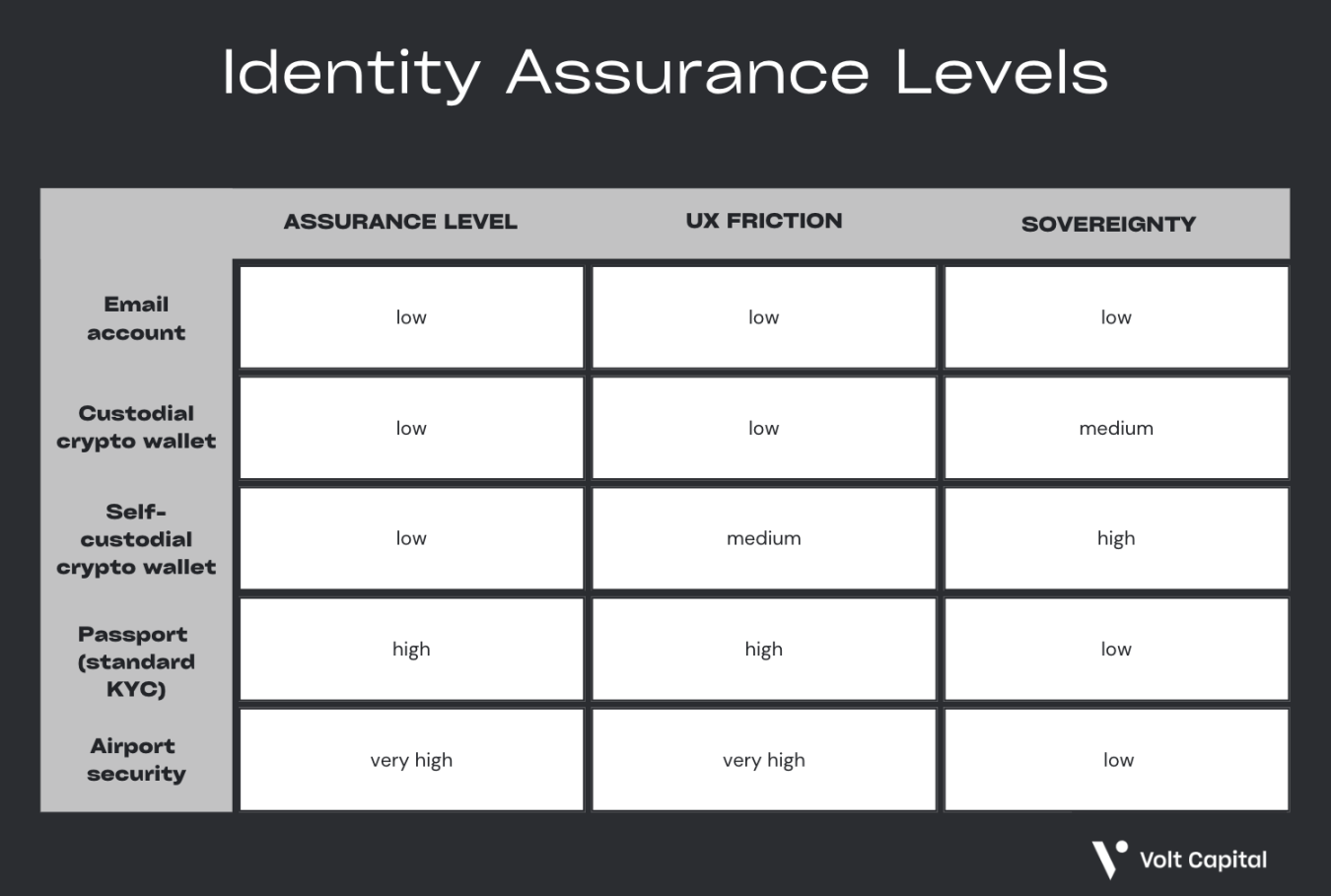 理想的身份解决方案应在不增加过多用户体验摩擦或损害主权的情况下提供最高水平的保证。然而,由于这样的解决方案尚未出现,加密创始人被迫在最适合他们用例的权衡中做出选择。