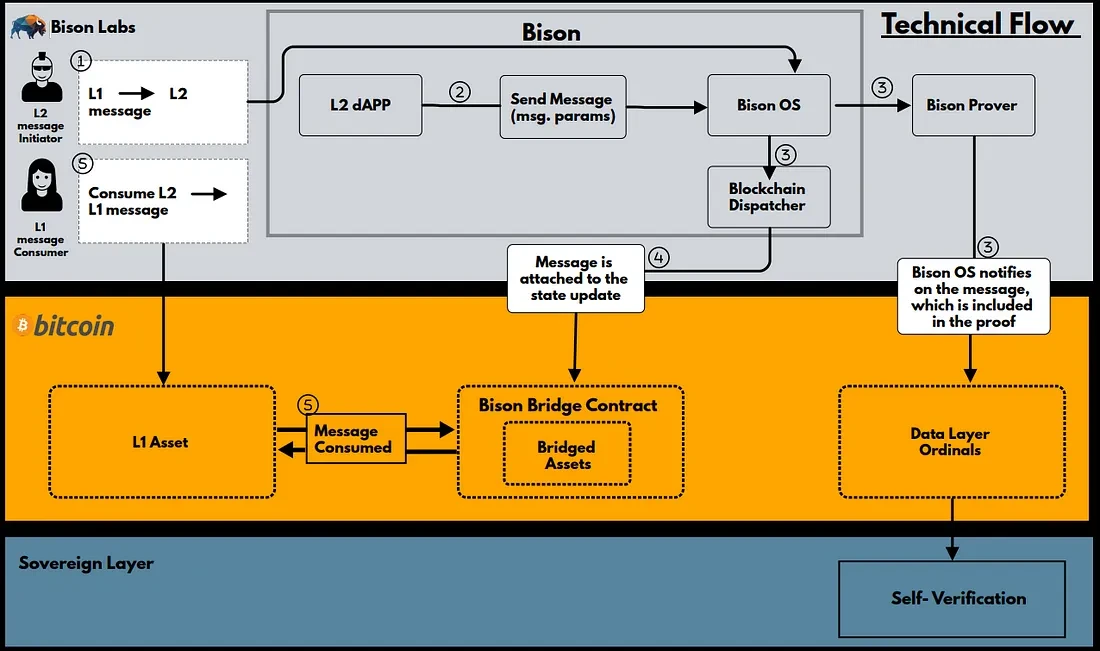 Bison 采用主权 rollup 风格来实现其比特币 L2。Bison 实现了使用 STARKs 的 zk rollup,并使用 Ordinals 作为机制将生成的 ZKP 和交易数据存储到 L1 中。由于比特币无法在 L1 上验证这些证明,验证被委托给用户,他们在自己的设备上验证 ZKP。从这个意义上说,Bison 更像是一个 Optimistic Rollup,但没有欺诈证明。