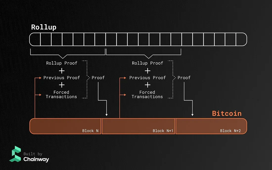 Chainway 正在比特币之上构建一个 zk rollup。Chainway rollup 使用比特币 L1 作为 DA 层来存储 rollup 的 ZKP 和状态差异。此外,rollup 利用证明递归,使每个新证明聚合在先前 L1 区块上发布的证明。证明还聚合了「强制交易」,这些是在 L1 上广播的与 L2 相关的交易,以强制将它们包含在 L2 中。这种设计有几个优点: