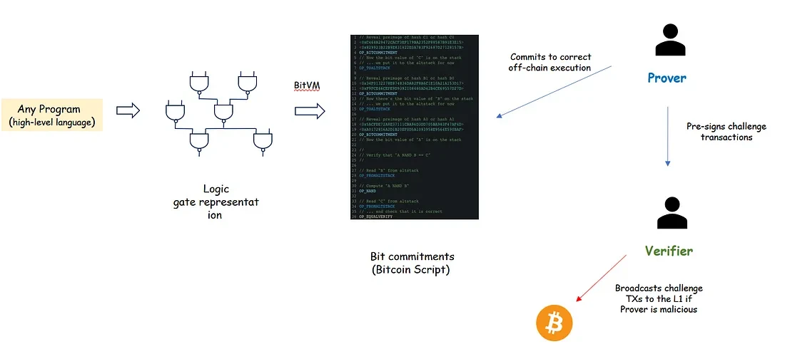 扩展比特币 L1 功能的一个尝试是 BitVM。这个概念建立在比特币的 Taproot 升级之上。BitVM 的概念是通过程序的链外执行来扩展比特币的功能,并保证程序的执行可以通过欺诈证明在链上受到质疑。尽管 BitVM 似乎可以用来在链下实现任意逻辑,但实际上,L1 上执行欺诈证明的成本随着链下程序的大小而迅速增长。这个问题限制了 BitVM 在特定问题上的应用性,例如信任最小化的 BTC 桥接。许多即将推出的比特币 L2 利用 BitVM 实现桥接。