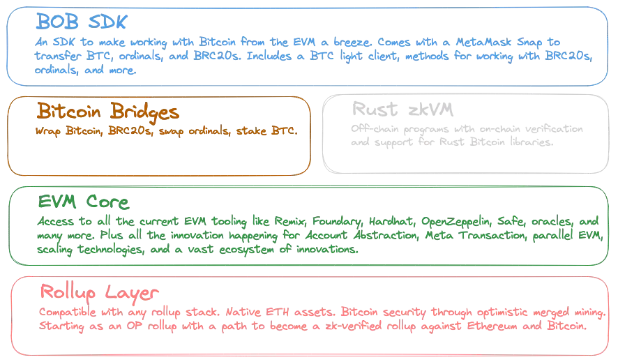 Bulid-on-Bitcoin(BOB)是一个旨在与比特币对齐的以太坊 L2。BOB 作为以太坊上的 Optimistic rollup 运行,并使用 EVM 执行环境来实现智能合约。