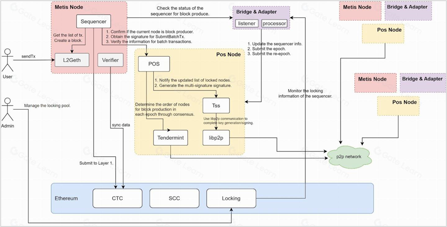 Metis 是首批实践去中心化 Pos 排序器的 Layer 2 网络,为未来的发展提供了一个范本。这个范本不仅实现了排序器的去中心化,还提供了一个基于 PoS(权益证明)的去中心化 Optimistic Rollup 解决方案。在这个范本中,Metis 的去中心化 Pos 排序器包含了三个主要角色:管理员、排序器和 PoS 共识层。