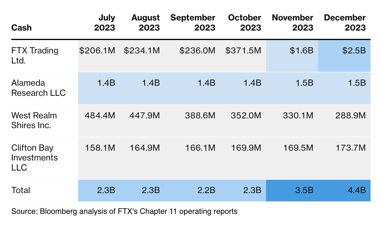 根据美国破产法第 11 章的月度运营报告,FTX 旗下四家最大子公司——包括 FTX Trading Ltd.和 Alameda Research LLC——在 2023 年底的现金储备几乎翻了一番,从 10 月底的约 23 亿美元增至 44 亿美元。如果算上其他子公司, FTX 的现金总额可能会更高。