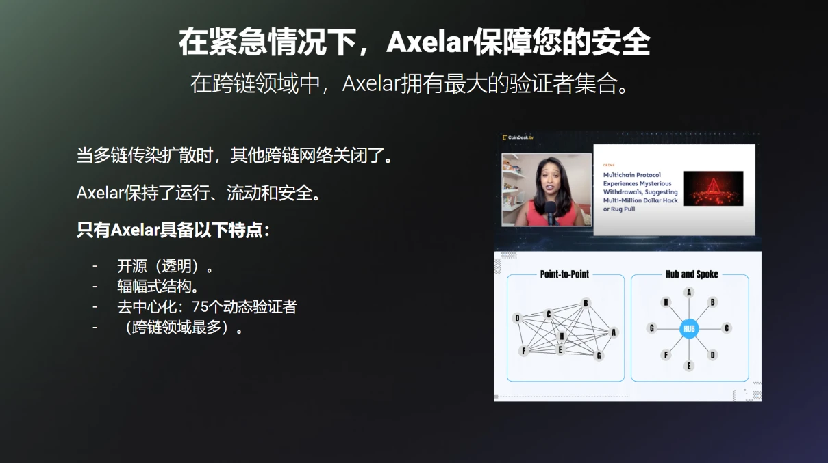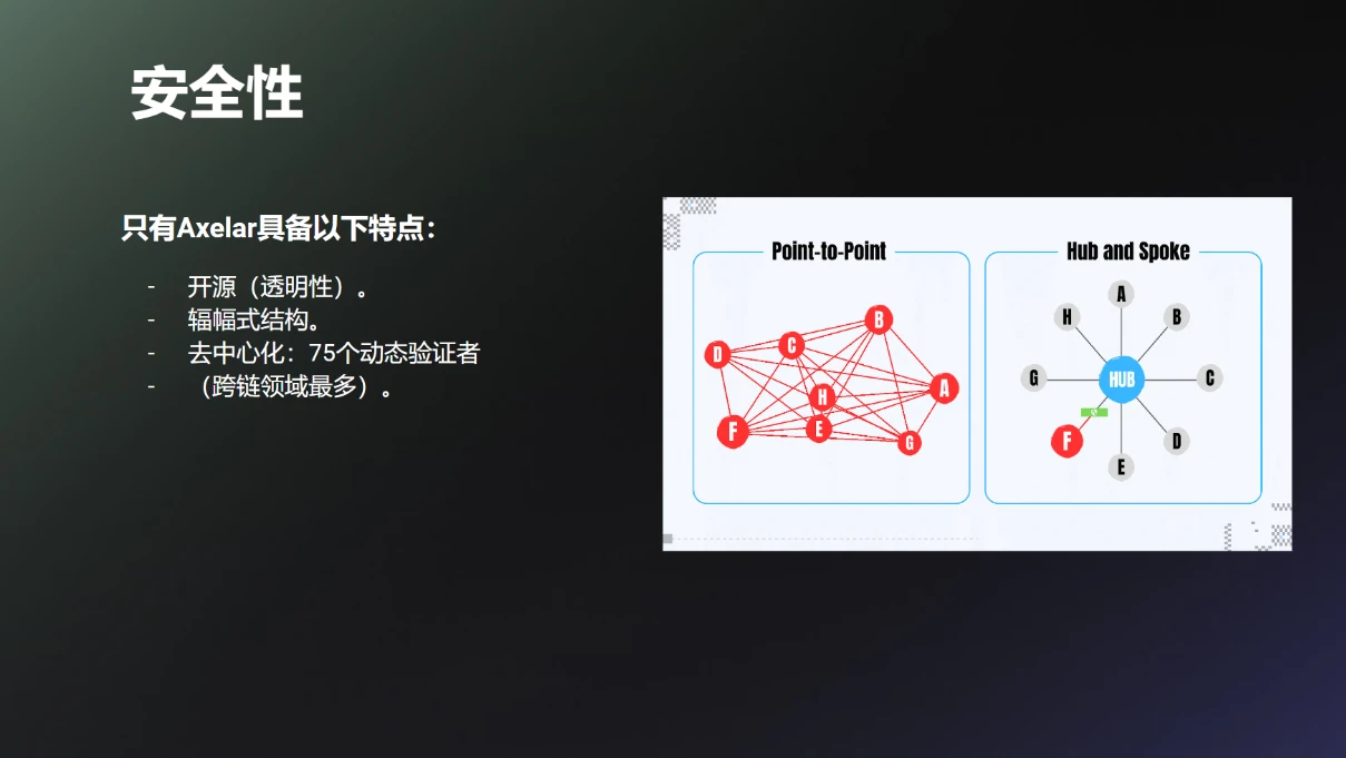 其次,我们已经解决了桥技术中存在的问题,并超越了传统桥的概念。Axelar(AXL)的网络本质上是一个区块链,并且我们利用这个区块链作为连接所有其他链的平台。我们始终坚持使整个平台成为去中心化的生态,而不是一个中心化的平台。目前,我们拥有超过 75 个验证者,验证者的选择也是动态的,我们的技术和验证方案都是去中心化的。我们始终坚信,不能用中心化的技术取代去中心化的技术。