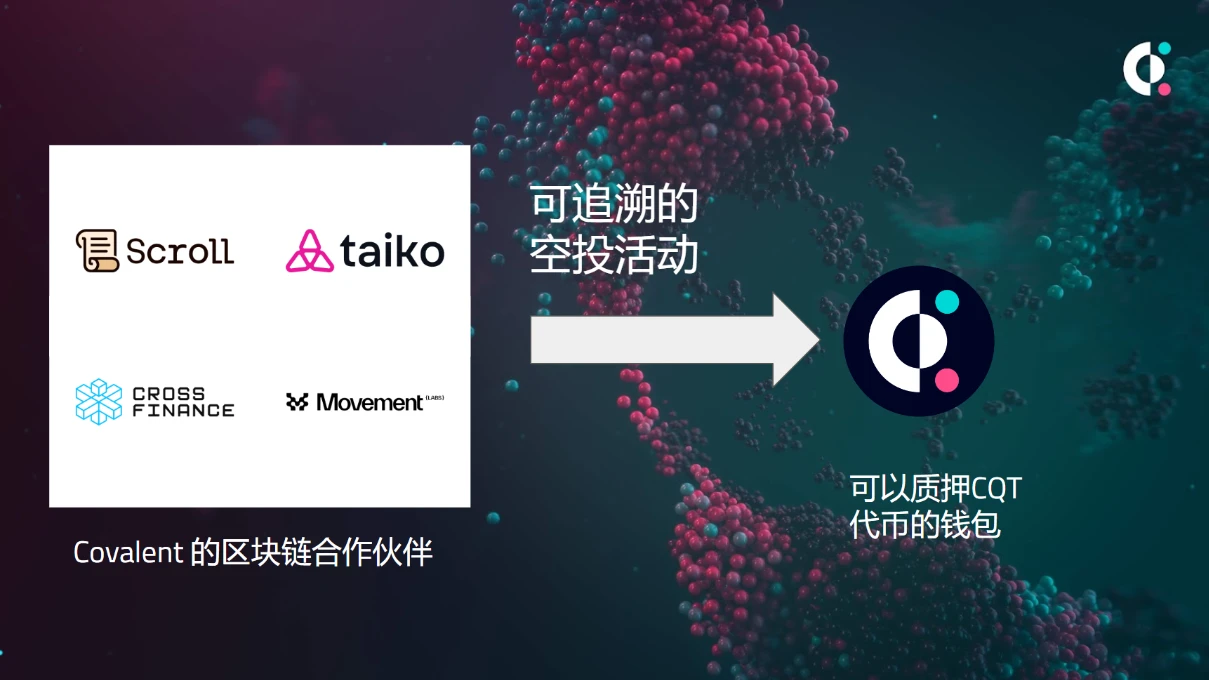 另外,我想补充一下项目的另一个方面。在左侧,我们列出了 Govalent 的区块链合作伙伴,包括 Scroll、Taiko、CROSS FINANCE、Movement 等。现在,这些合作伙伴以及 CQT 代币本身都可以在钱包内进行质押。这个项目在一年半之前就开始与其他代币团队进行深入的交流和沟通,最终实现了这一目标。这就好像不同代币之间的"联姻",能够在同一生态系统中实现更稳定的代币发展和联盟。实现这一点并不容易,但通过一年半的交流、沟通和协同努力,我们发现通过代币的相互质押,是向其他代币持有者和社区表达感激和合作意愿的最佳方式。