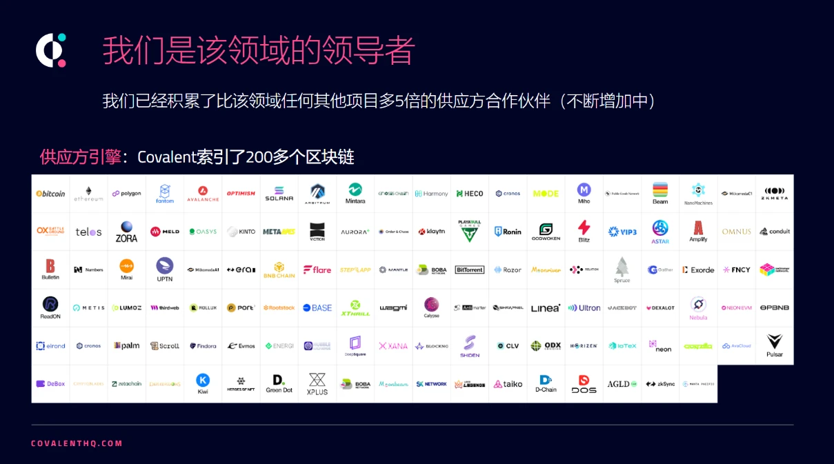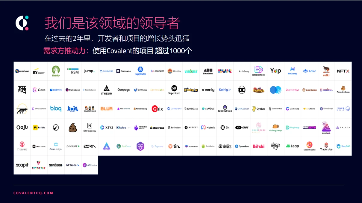 截至 2023 年 12 月,Covalent(CQT) 支持 210 多个区块链,并为许多加密货币公司提供了数据,涵盖了广泛的用例既包括加密原生的 DeFi 协议、NFT 协议,也包括到像 EY(安永)、Fidelity(富达)、Jump、 ConsenSys 这样的大型企业。Covalent(CQT)在全球范围内保护着最大、最丰富的结构化Web3数据集,在 2024 年底 Covalent(CQT)计划将支持 1000 多个区块链,为 2024 Web3大规模应用的爆发护航。