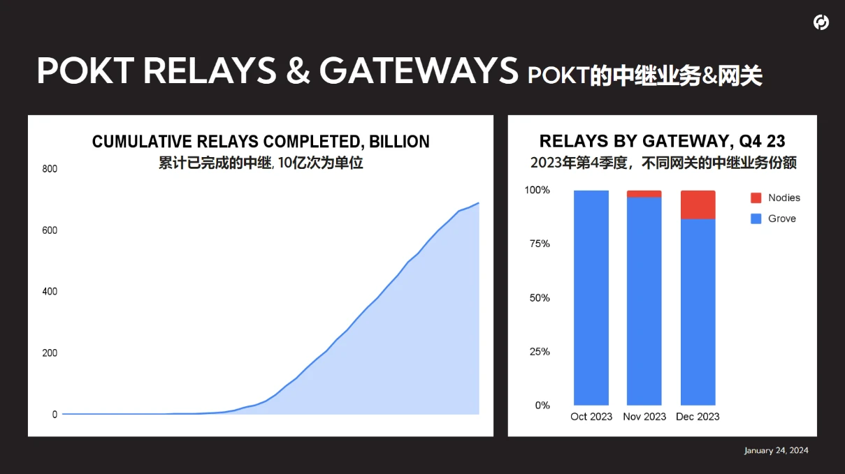 第三,我们也关注到了通缩的问题。最近,根据用户需求,我们开启了更多的网关。我们发现,随着工作量的增加,需要烧掉更多的 Pocket,并增加节点的质押。因此,我们需要关注通胀情况的控制。在展示的 PPT 中,可以看到 Pocket 所完成的业务和提供的网关服务。我们目前提供了两项主要服务,这为我们在 2023 年业务发展方面提供了支持。在此基础上,我们还将推出更多的业务和服务。