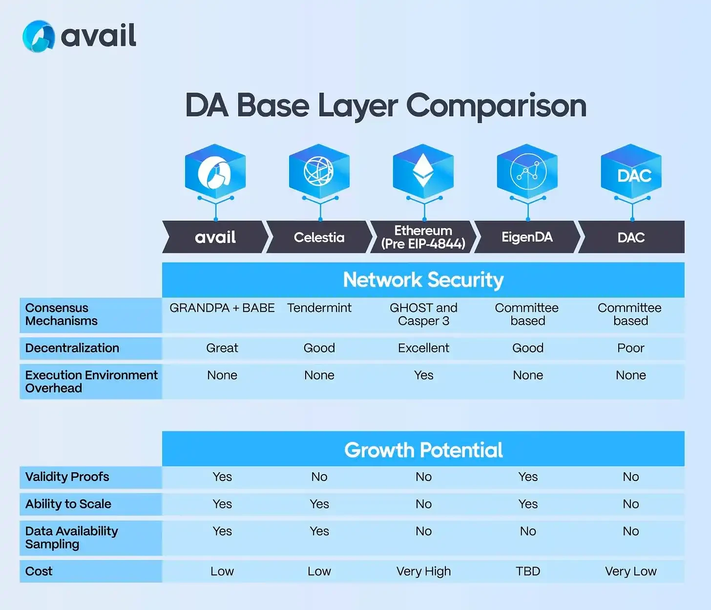 最后,Avail 对主要 DA 层的核心组件进行了有益的比较。