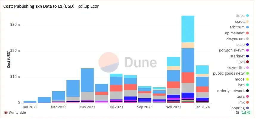 数据可用性层已成为模块化架构的重要组成部分,充当可插入组件来降低成本并扩展区块链。DA 层的核心功能是确保链上数据可供所有网络参与者使用和访问。从历史上看,每个节点都必须下载所有交易数据以验证数据是否可用——这是一项效率极低且成本高昂的任务。这就是大多数区块链目前的工作方式,也是可扩展性的障碍,因为验证所需的数据量随着块大小线性增加。最终用户在这里遭受损失:数据可用性成本占用户在 Rollup 上进行交易所产生的交易成本的 90% (目前 Rollup 将交易数据发送到以太坊的成本为 1300-1600 美元/mb)。