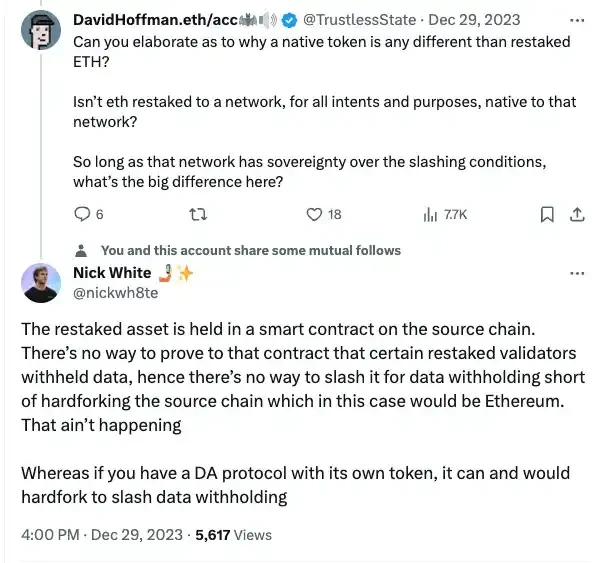 Celestia 团队认为,为了安全性,代币是必要的,而 EigenDA 最终将需要代币,因为不可能削减链上数据的可用性。他们认为,为了确保节点是诚实的、数据可用并惩罚恶意节点,网络必须能够通过包括原生代币在内的激励结构进行验证。在这里,Celestia 的 Nick White 提出了对 EigenDA 的批评:「除非源链被分叉,否则保留数据的重新验证器不会被 slash——这是极不可能的,因为这是以太坊。」