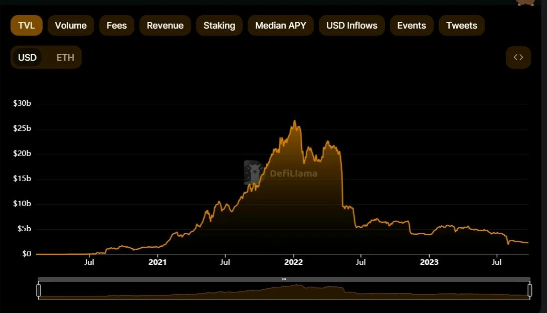 项目于 2021 年 6 月上线,此后 TVL 一直处于上升状态,于 2022 年 3 月份达到最高值,约 18 亿美元。自 2022 年中开始,TVL 也急剧下滑,至今已经降至 8000 万美元左右。
